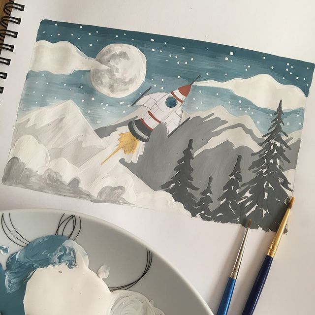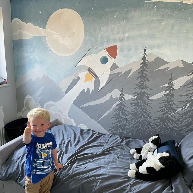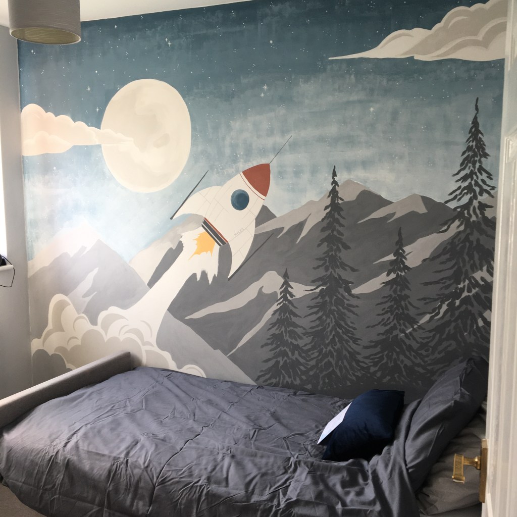 Myles loves space and landscapes, Vickie didn’t want the scheme to be to dark with a space theme so I suggested an ombre sky so it wasn’t one block colour, then adding in the clouds and a big moon with mountains in the foreground to add depth. The rocket then shoots across the wall followed by the smoke.
