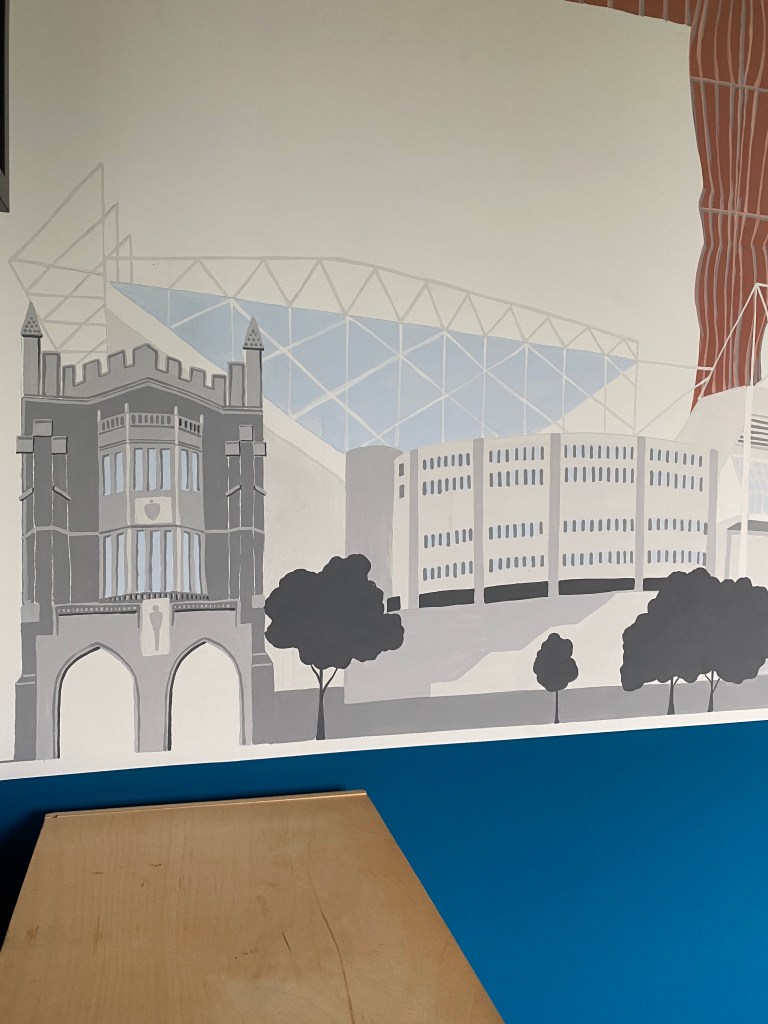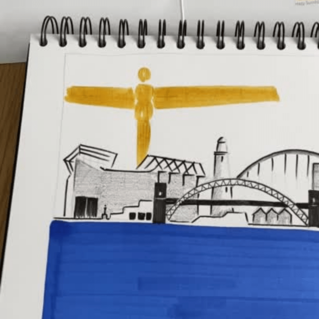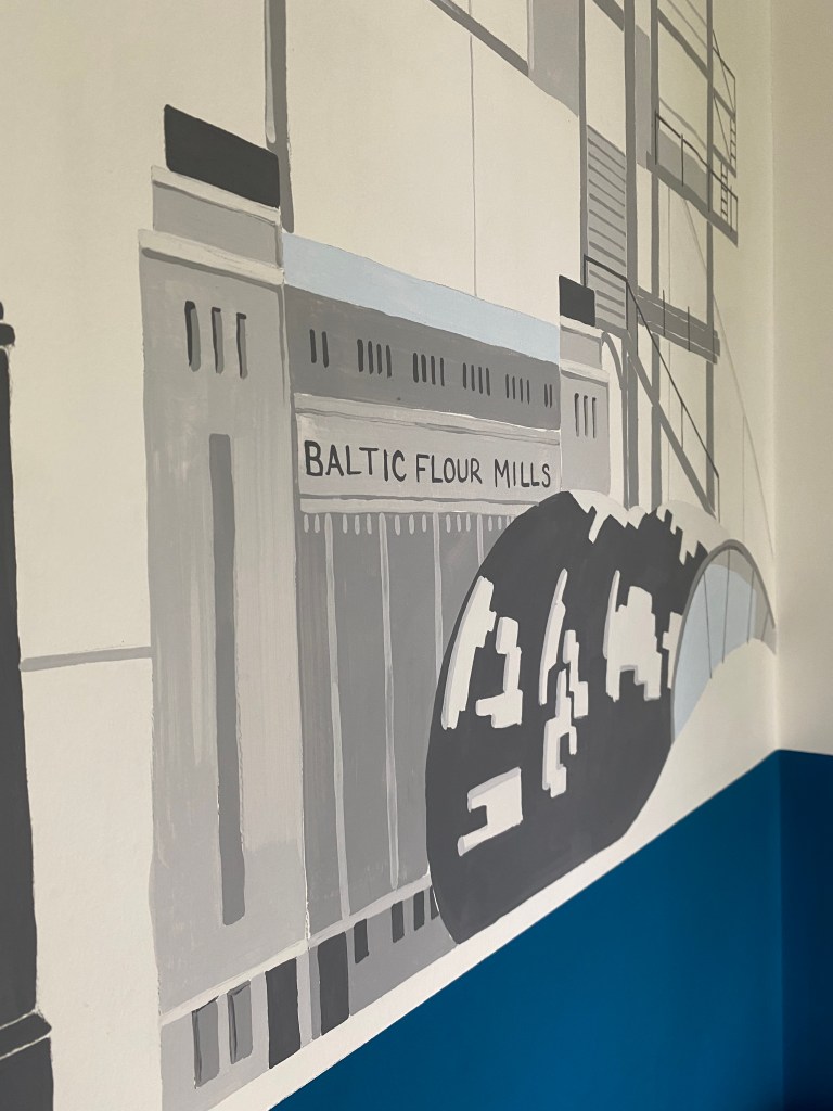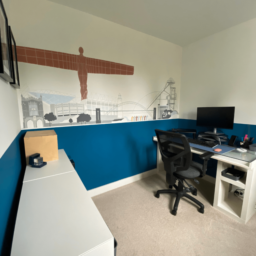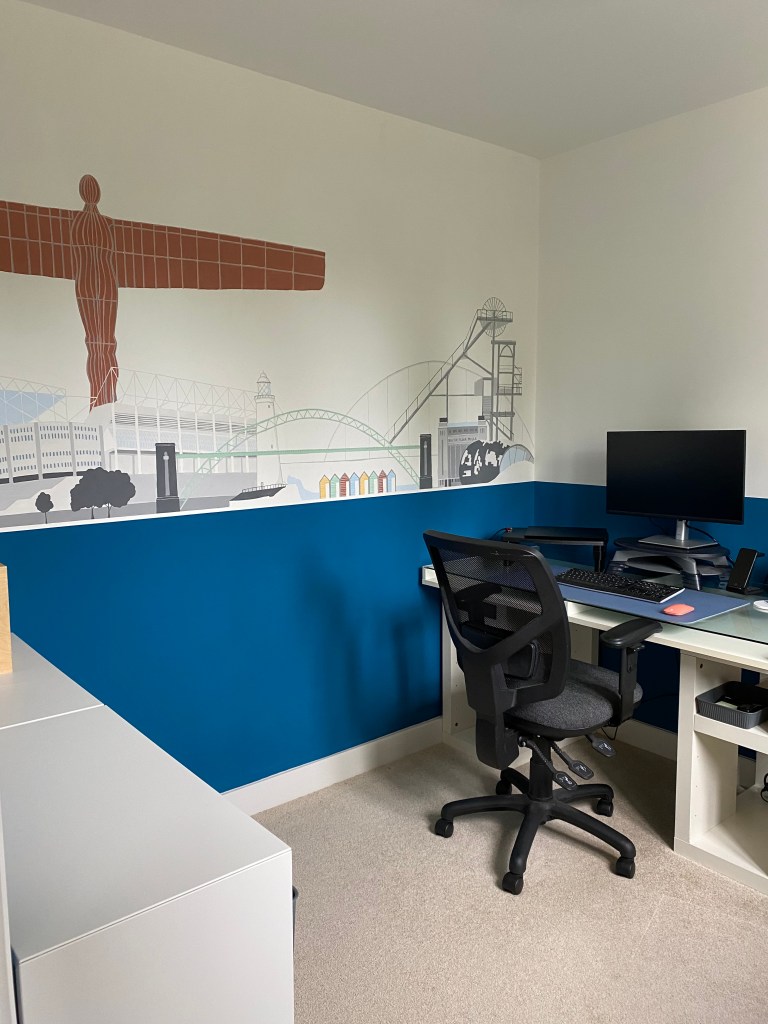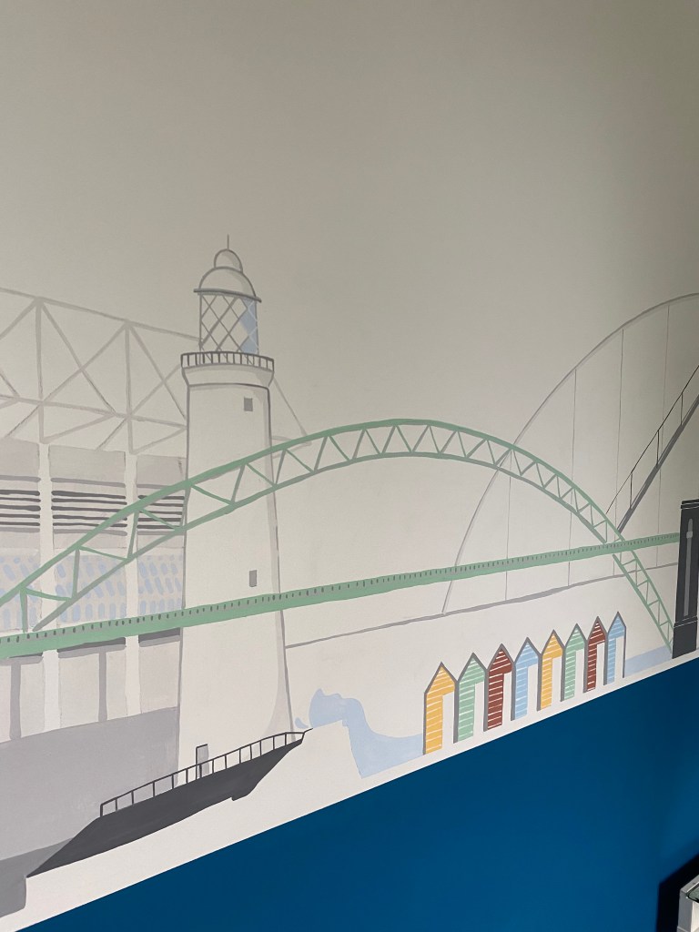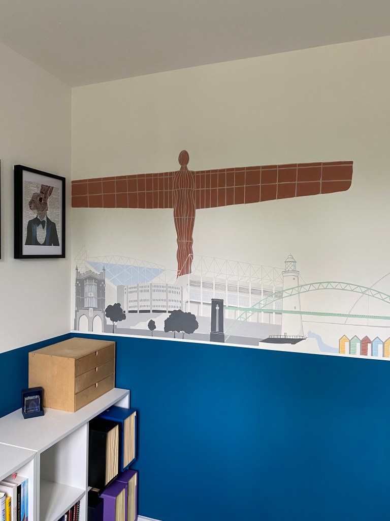He then showed me his office space. Like most of us I’m sure, Andrew was made to work from home during Covid and now only pops into the office occasionally. He had been staring at the blank white walls of his office for too long and wanted to make it his own. Andrew grew up in Newcastle and he loved the idea of bringing some of it with him by having some of the landmarks that have special meanings to him onto his wall.
