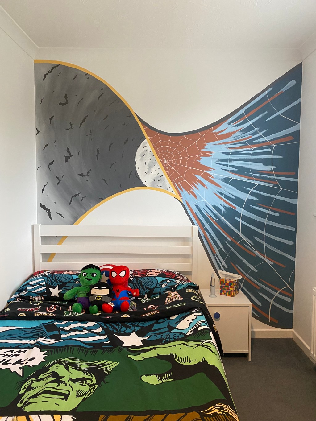Kirsty, and Elliott, wanted a marvel theme to his bedroom, so I came up with this design inspired by his 2 favourite characters, Batman and Spiderman.