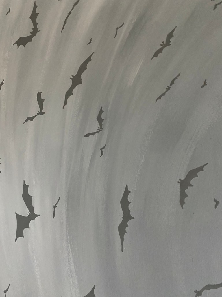 This design took a day to complete, even with a delayed start due to travel issues. I loved painting the bats flying out from the moon, the little details that can make a design, but also enjoyed the freeness of the strokes on the Spiderman side.