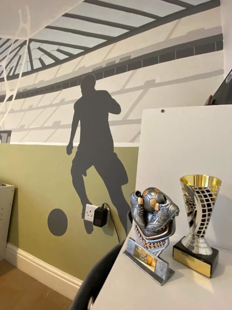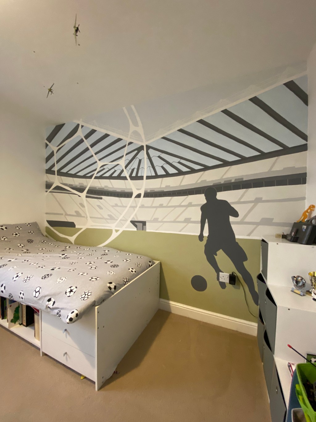 Rachel messaged asking for some help with her son’s bedroom (Harrison). He is a huge football fan and supports Newcastle just like his dad. He really wanted a football themed room. Rachel asked if I could paint a 2D football pitch for him. I said of course I can but may I also show you another design option, that will be timeless.