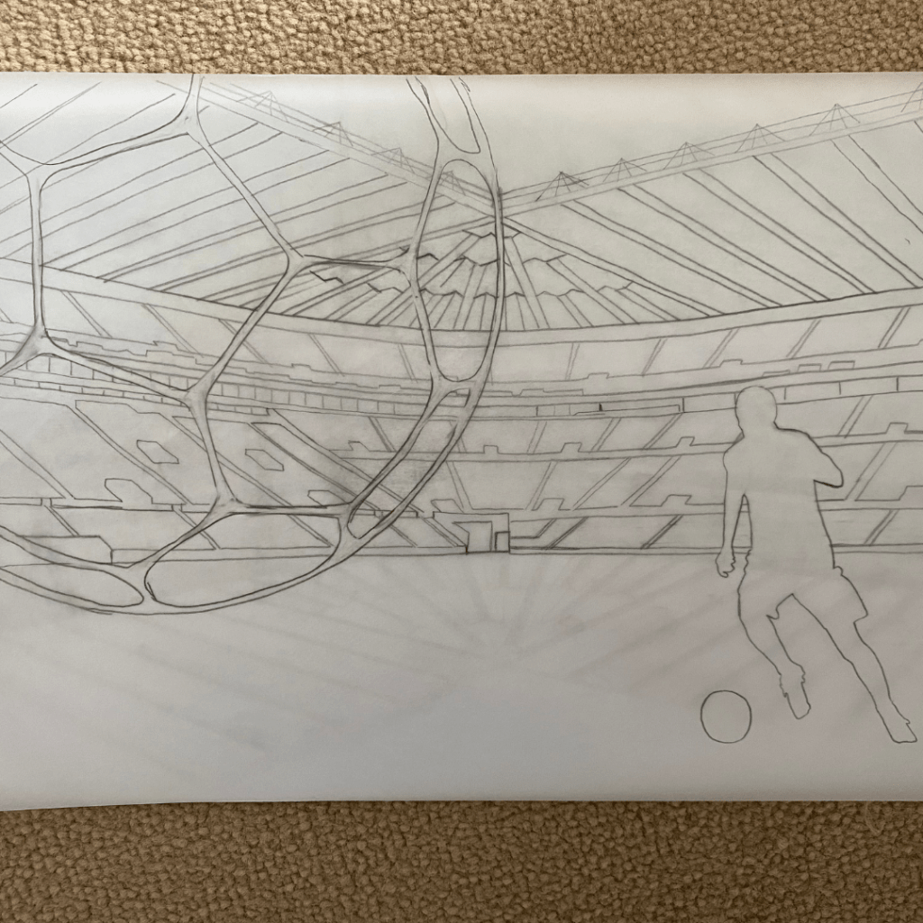 I drew up this design – the corner of the stadium with a silhouette of a footballer (to change with the times, as favourite players can change quickly lol) Over the top it would have a football overlay. Rachel didn’t want the room to be all black and white so I added green grass and blue sky and then various shades of greys to give a softer look.